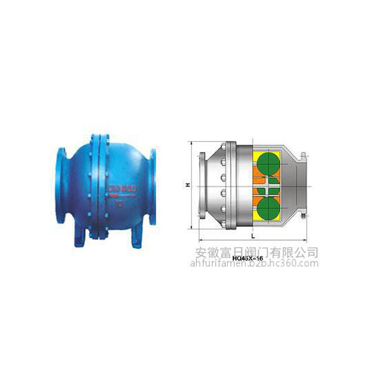 安徽富日閥門生產的HQ45X微阻球形止回閥,采用橡膠包皮滾球為閥瓣,在介質的作用下,可在閥體內的整體式滑道上作上下滾動,從而打開或關閉閥門,密封性能好,消聲式關閉,不產生水錘。閥體采用全水流通道,流量大,阻力小,水頭損失比旋啟式小50%。水平或垂直安裝均可,可用于冷水、熱水、工業及生活污水管網,更適合潛水排污泵,介質溫度為0-80℃。